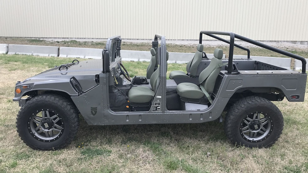 GuerrillaRig Smoked Grey 4 Door Convertible Humvee - ON-ROAD TITLE - 1991 AM General M998 Humvee HMMWV, 6.2L Diesel Engine, 23K Miles, Automatic Transmission, 4x4, 7,700 lb. GVWR, 4 Open Doors, Brand New 20" Custom Rims & 37" Custom Tires, Pintle Hitch, 4 Custom Seats, Baha Style Roll Cage, Custom Smoked Grey Body Paint, Black Underbody Paint, LED Headlights, Front Brush Guard, Charger Port (Phone/USB), Marine Bluetooth Radio w/ Speakers, 4wd Independent Suspension, Runs Great! Drives Great! Ready for Summer Fun! (Texarkana, TX) CUSTOMIZED w/ soft top, hard doors (new), headlights, brush guard, removed rollbar.